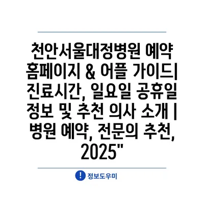 천안서울대정병원 예약 홈페이지 & 어플 가이드| 진료시간, 일요일 공휴일 정보 및 추천 의사 소개 | 병원 예약, 전문의 추천, 2025″